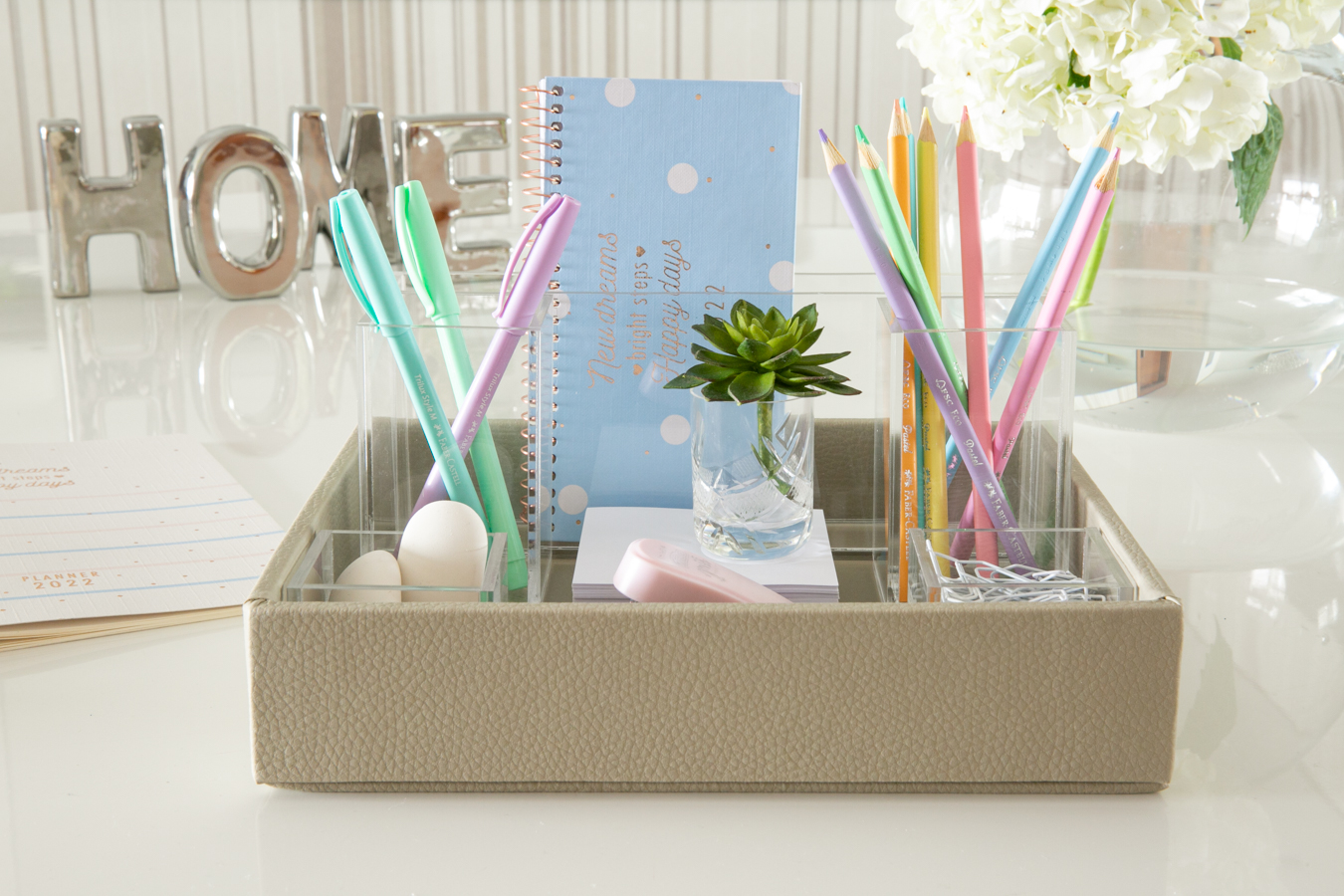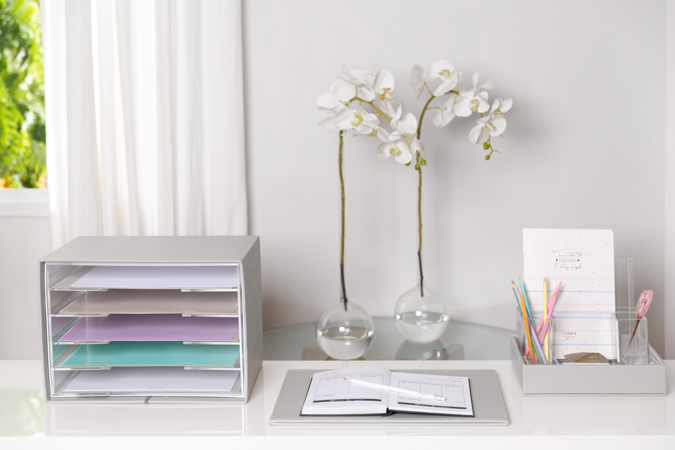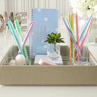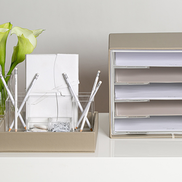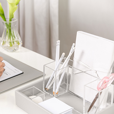 Os organizadores de materiais de escritório em acrílico podem ser usados dentro ou fora da bandeja.