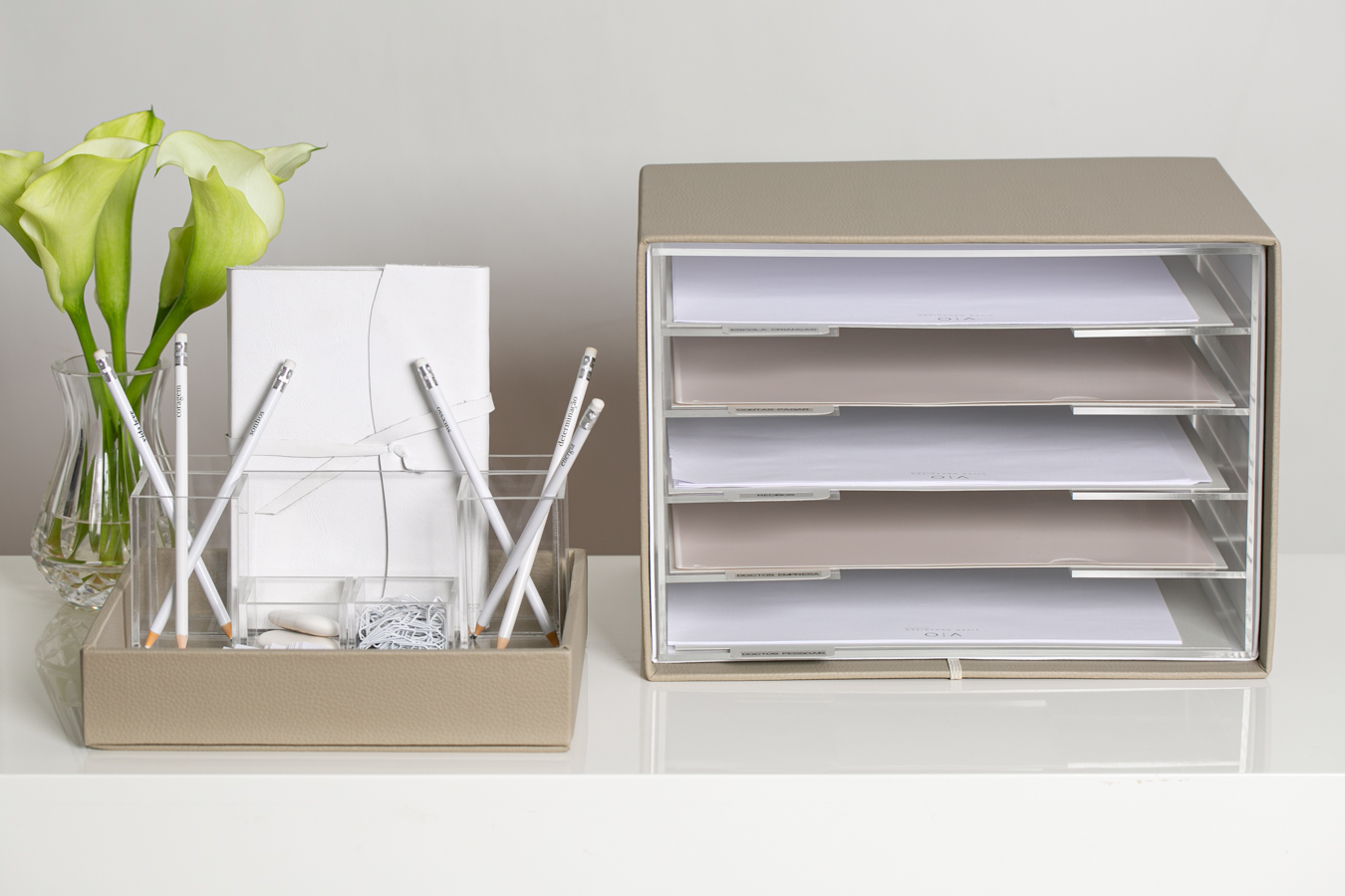 Nossas bandejas são desenvolvidas em cartonagem dupla com material de alta qualidade, resistente e durável. A parte interna e externa é revestida de couro sintético. Os organizadores de materiais de escritório são feitos em Acrílico de 4mm.