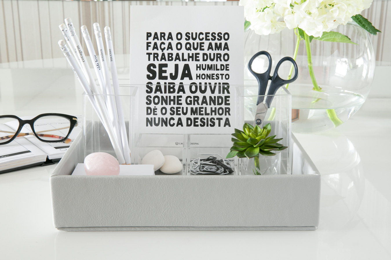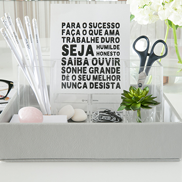 Uma mesa de trabalho organizada promove seu bem-estar e foco nas tarefas do dia, além de trazer leveza e harmonia ao seu espaço de trabalho.