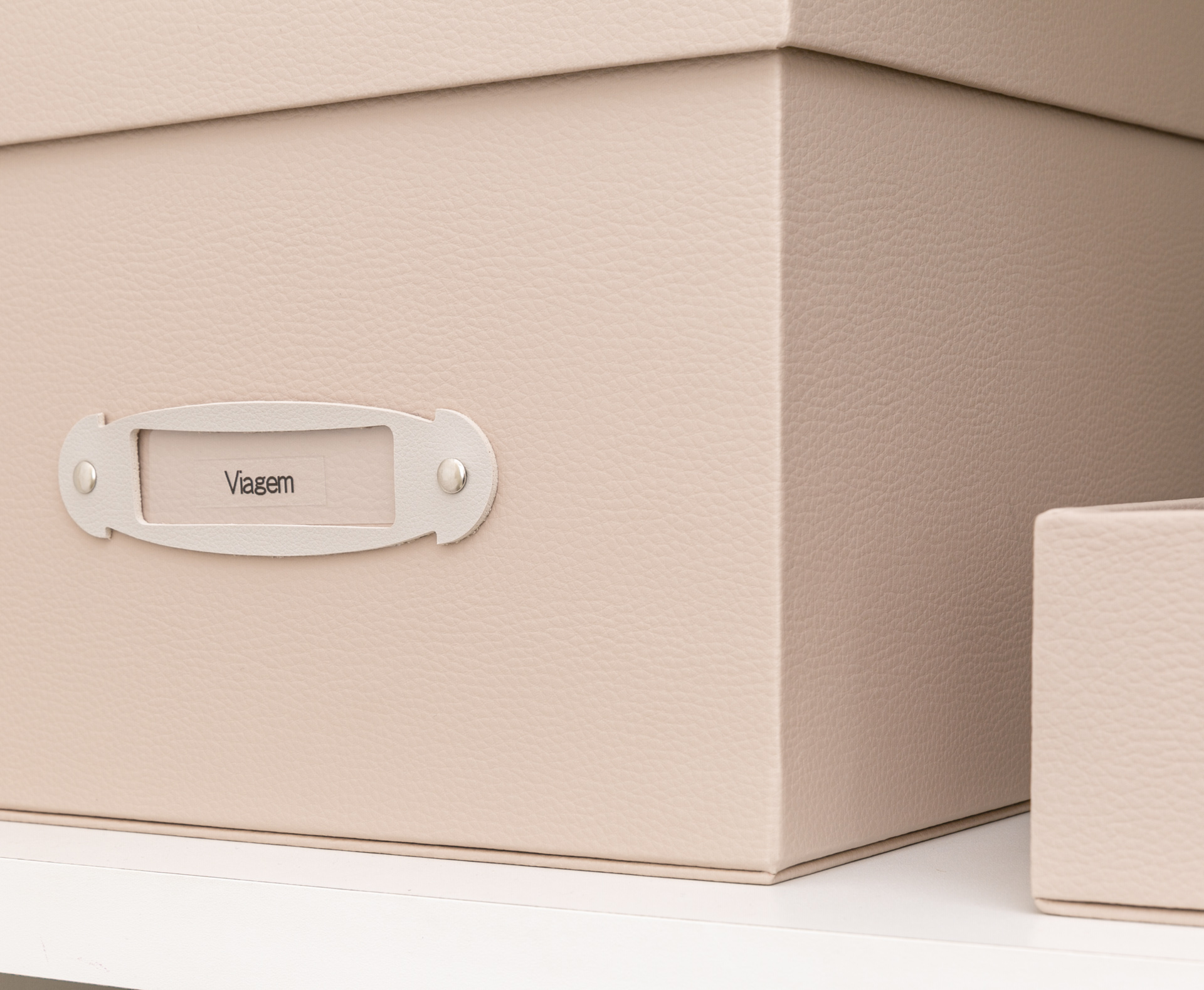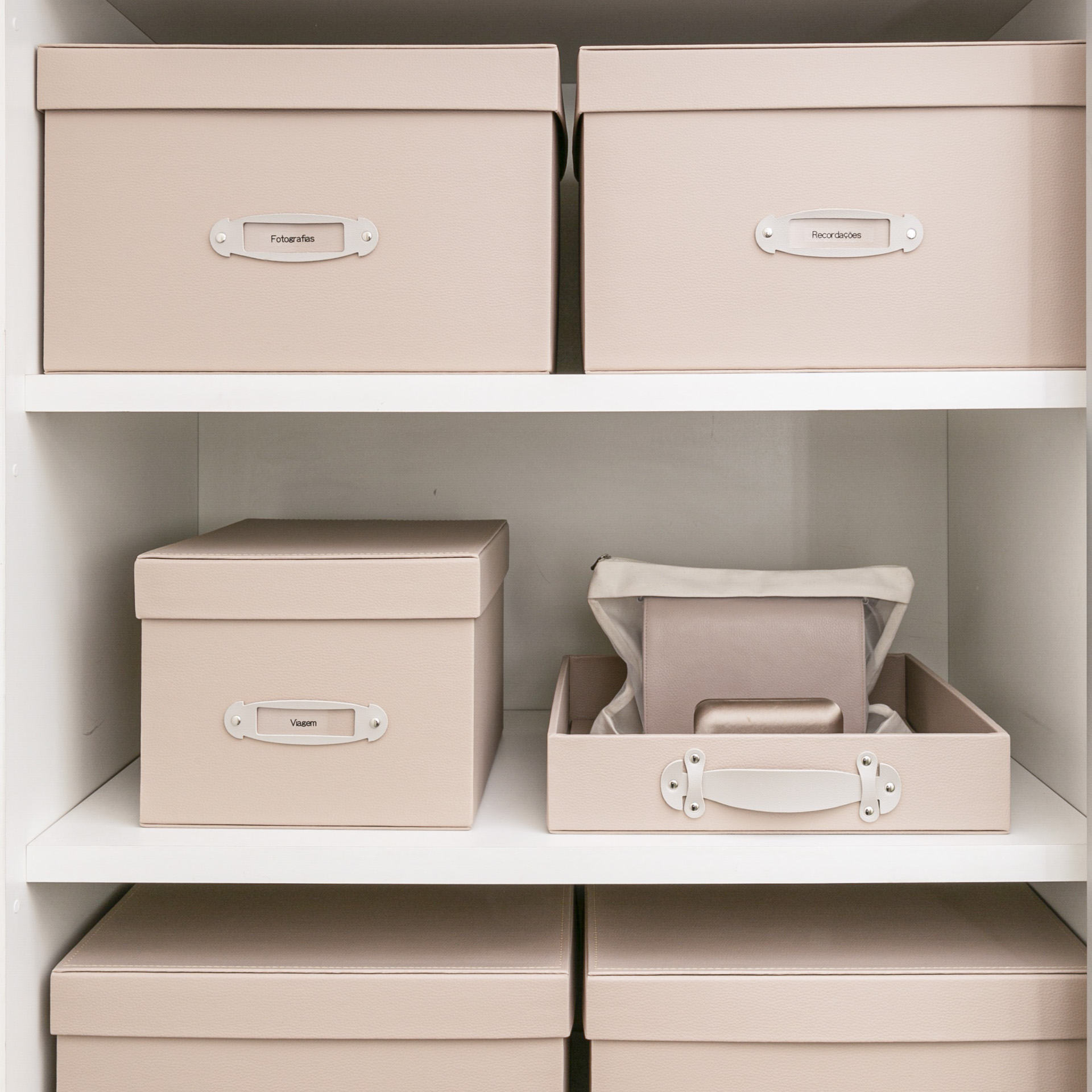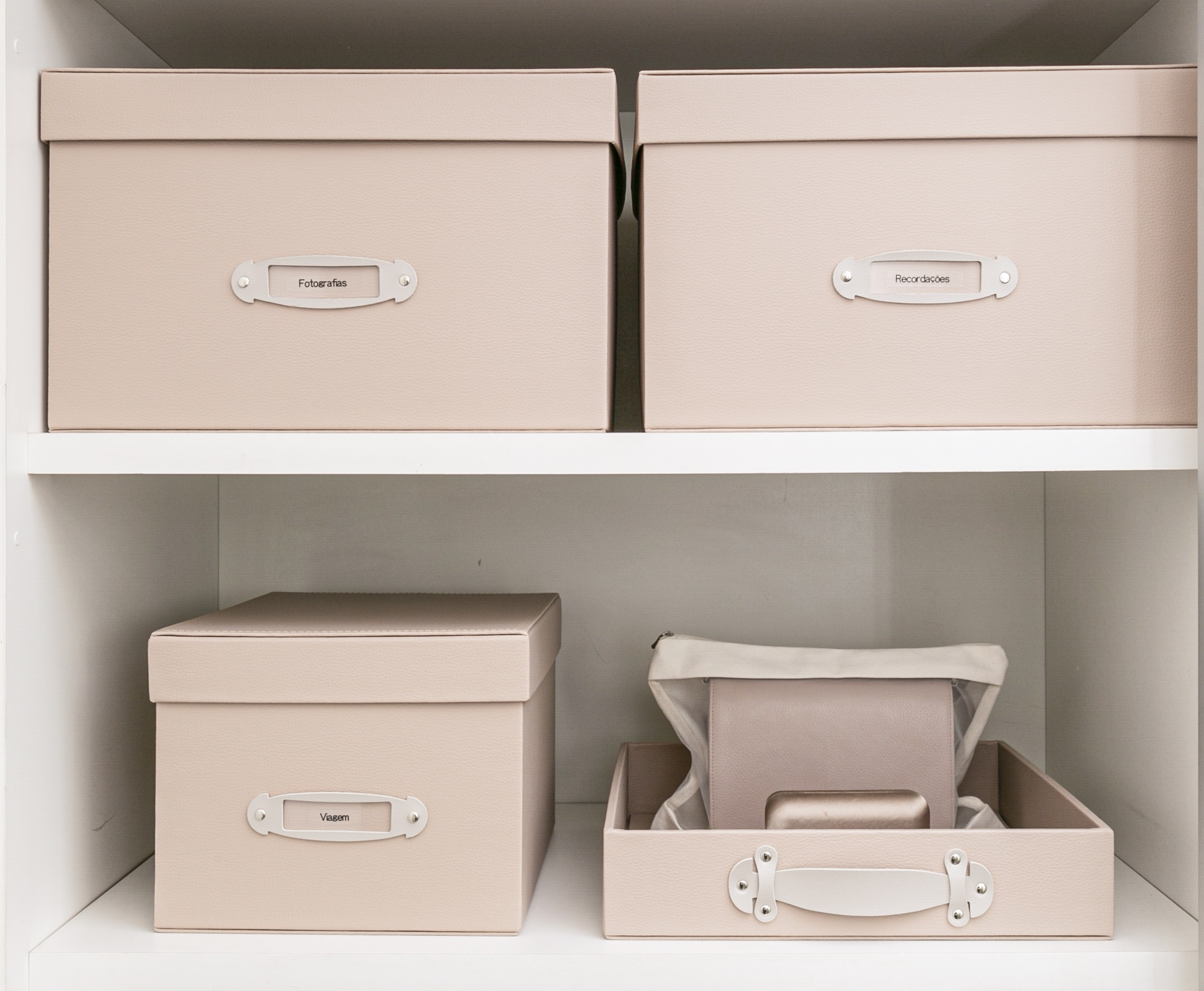 As caixas organizadoras são ótimas aliadas da organização. Além de acomodar itens diversos, elas proporcionam um visual lindo e decorativo para seu espaço. Sabe aquelas peças de inverno que você usa esporadicamente em algumas semanas do ano? Pois bem, elas são perfeitas para serem guardadas nas caixas de couro. Assim, você libera as gavetas para guardar peças de uso mais frequente e evita deixar essas peças de inverno soltas nas prateleiras altas do seu closet.