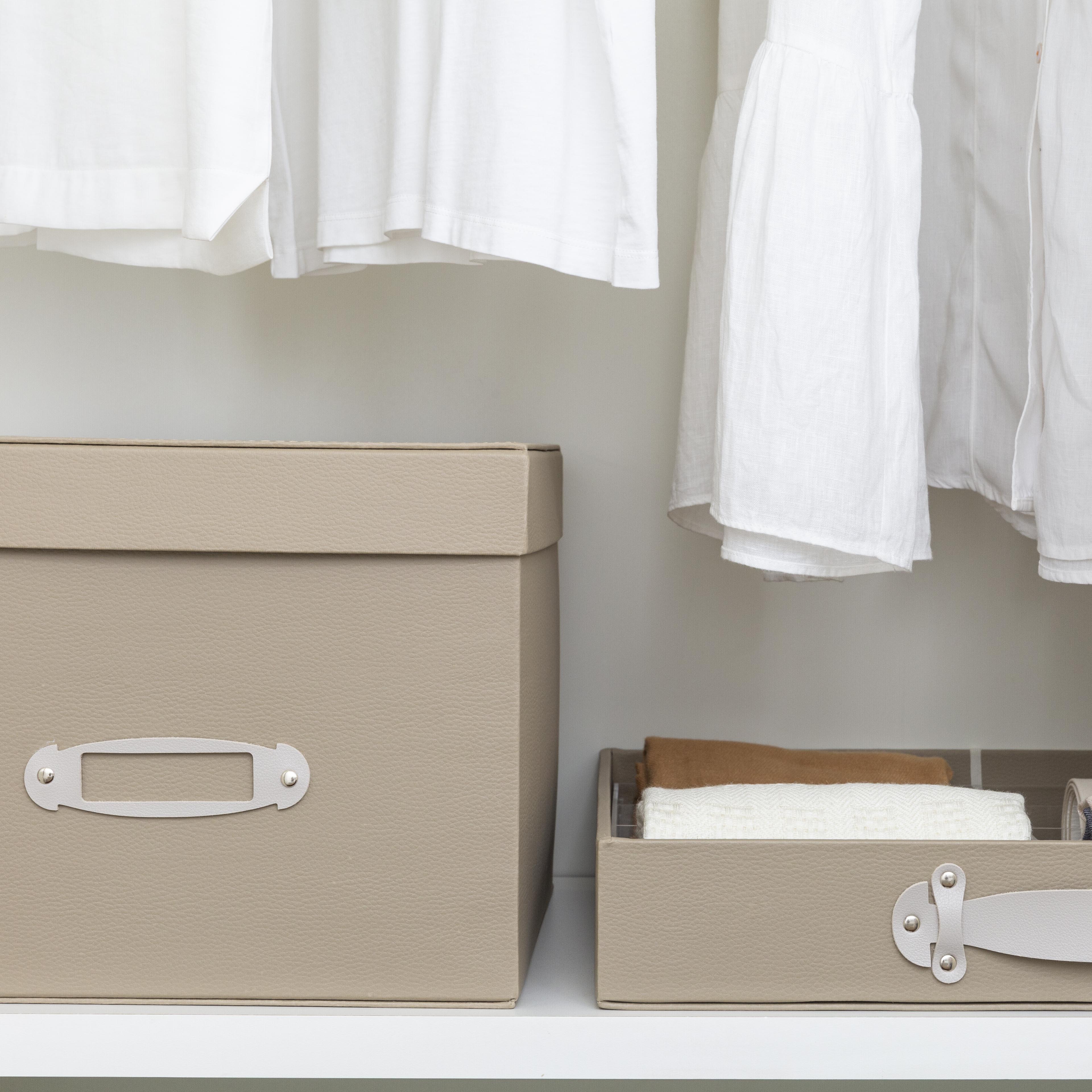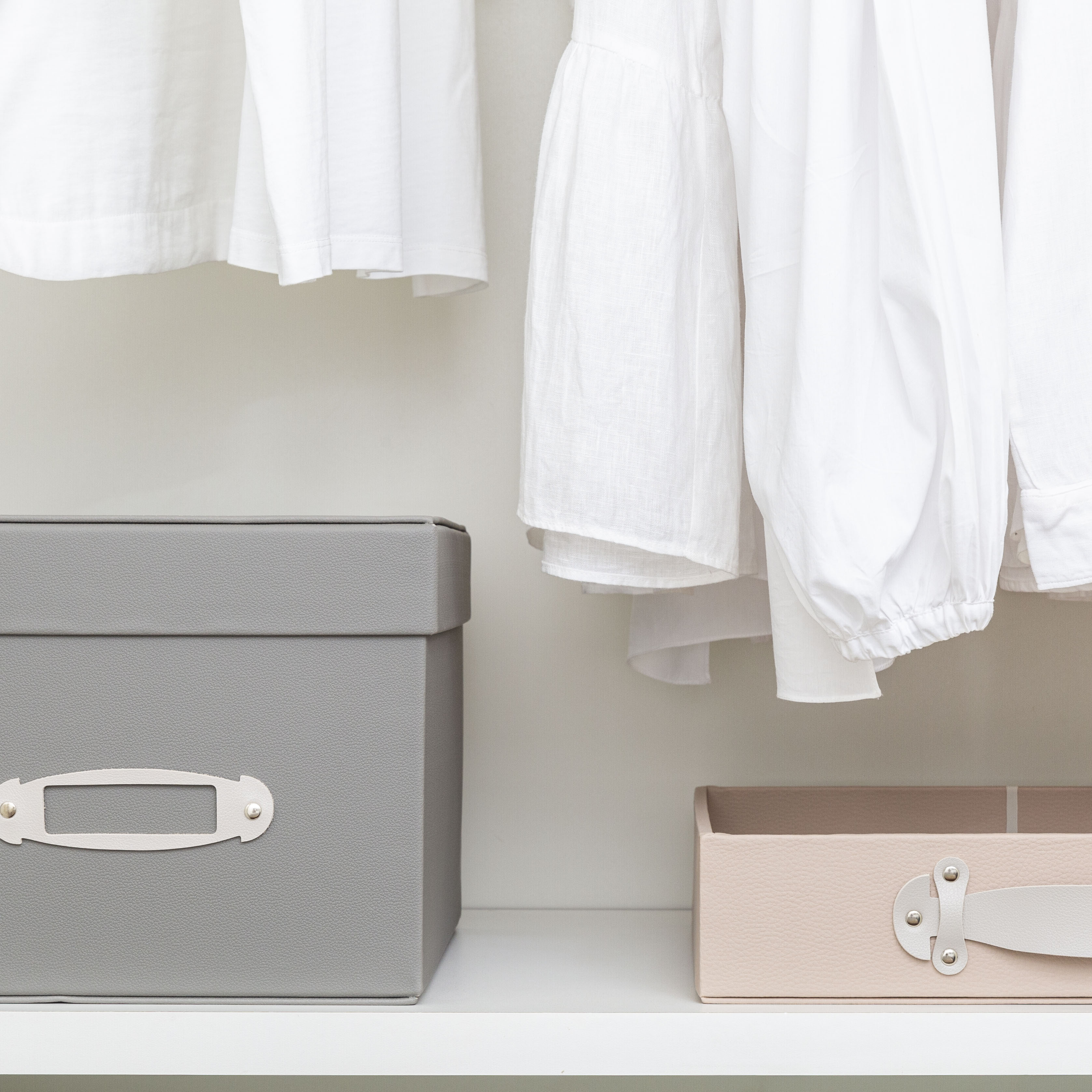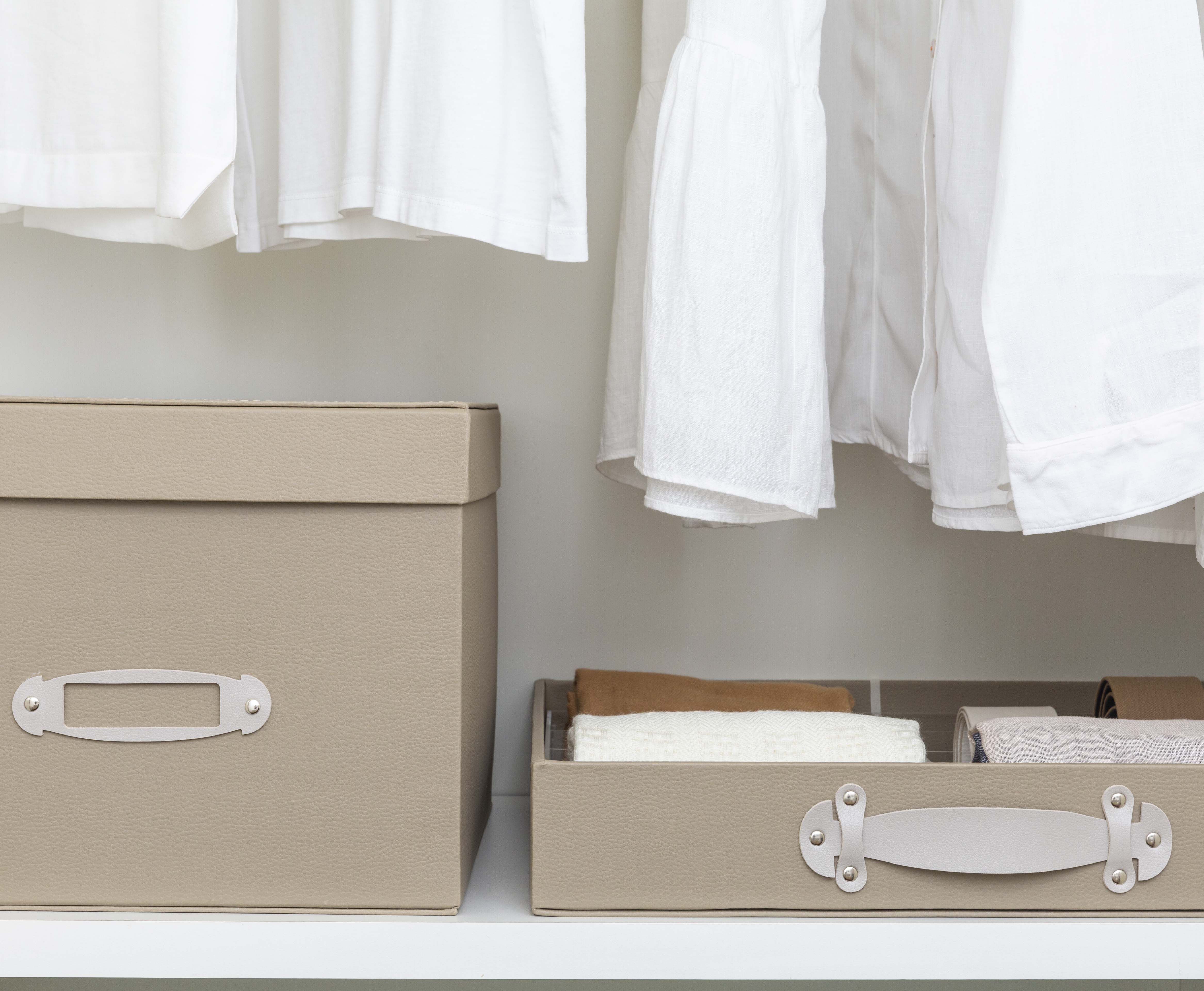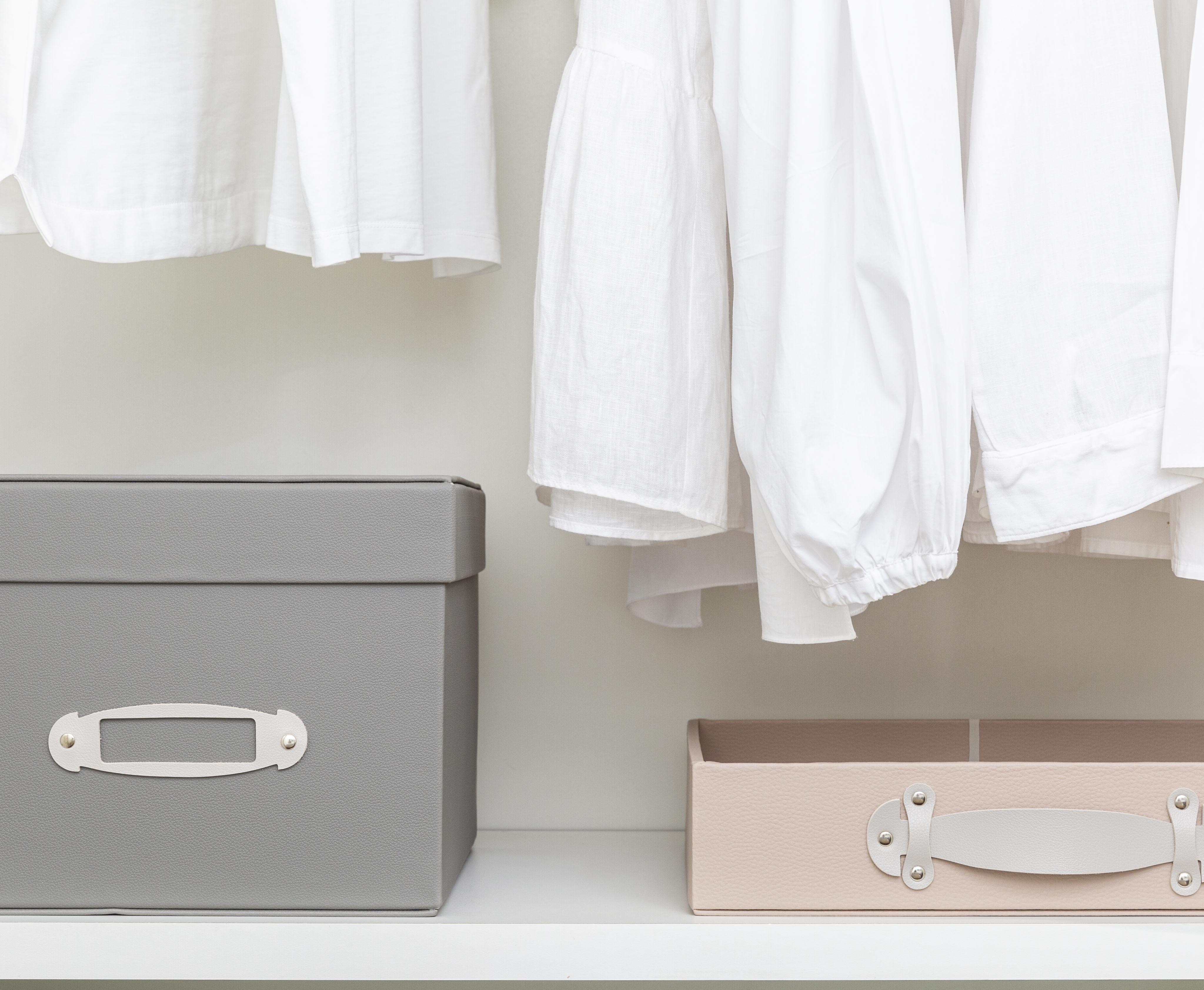As caixas organizadoras são ótimas aliadas da organização. Além de acomodar itens diversos, elas proporcionam um visual lindo e decorativo para seu espaço. Sabe aquelas peças de inverno que você usa esporadicamente em algumas semanas do ano? Pois bem, elas são perfeitas para serem guardadas nas caixas de couro. Assim, você libera as gavetas para guardar peças de uso mais frequente e evita deixar essas peças de inverno soltas nas prateleiras altas do seu closet.